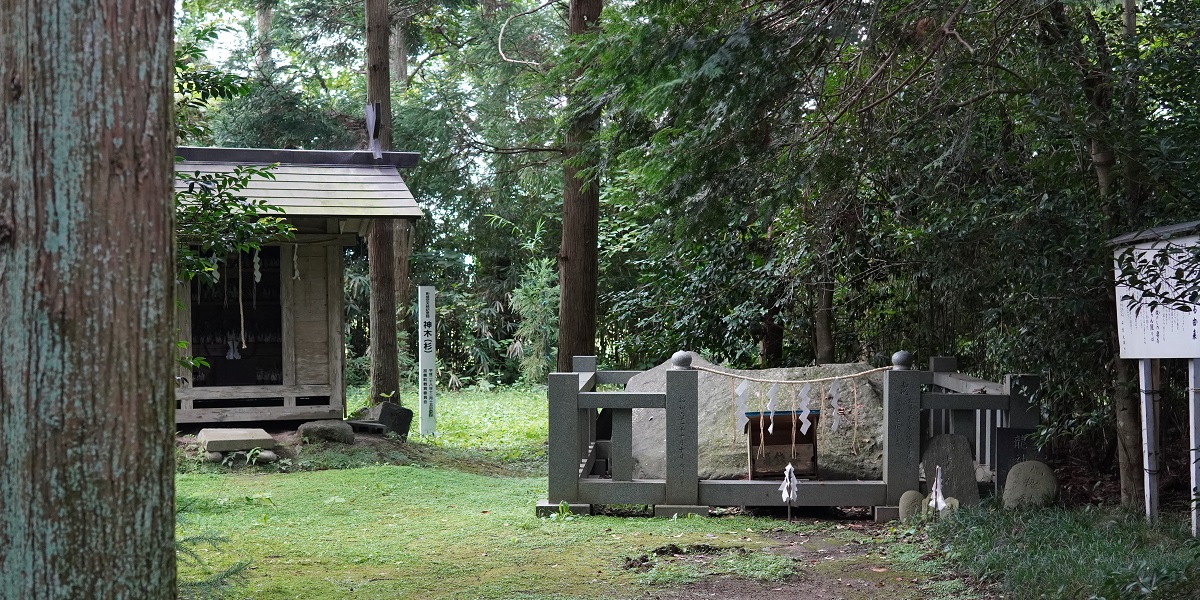 加美町鎮守鹿島神社社殿の西御山下の老杉の根元に要石があります。