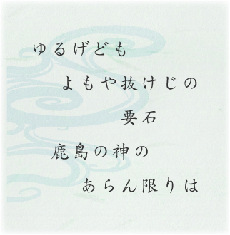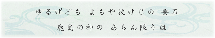 上記古歌は、要石に鹿島の大神が降臨して守護っているから日本の国土はぐらぐらしないと云う意味です。要石は鹿島神社以外の神社には祀られていません。俗に要石を拝むと云う事は家庭的にも社会的にも、精神的にどんな地震が起きたとしてもびくともしない不動の精神を養うと云う信仰の精神を持つということです。すなわち人間の「へそ」であり、其の「へそ」が要石とも云えます。